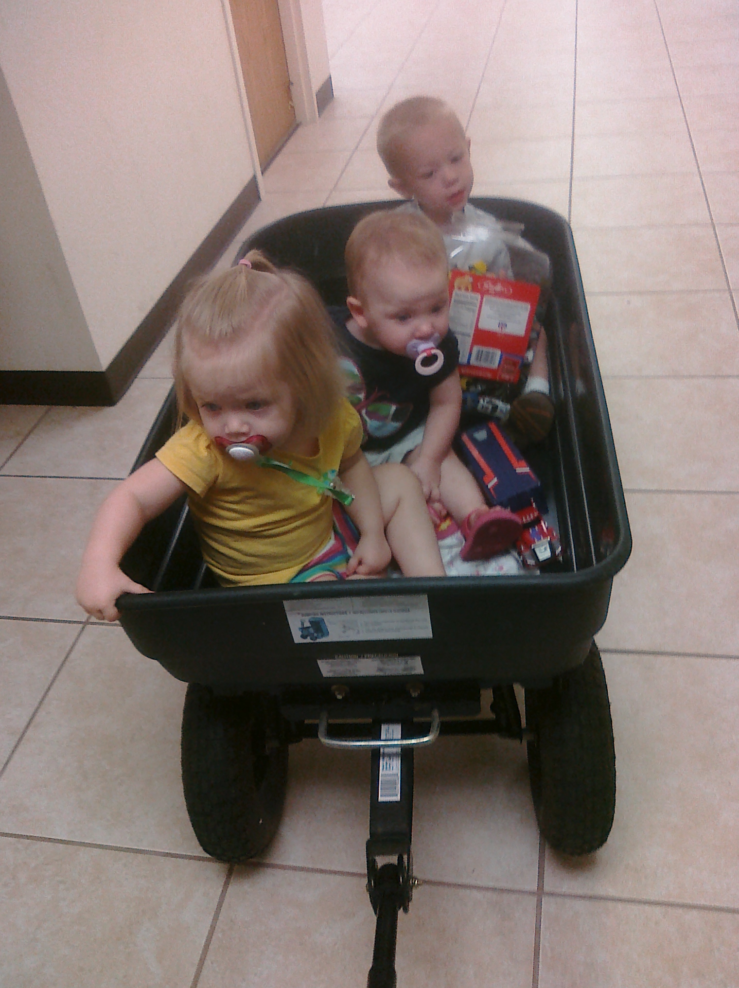 During my church’s Vacation Bible School this week, I am taking care of and teaching the babies through three-year-olds. I am determined to not just “provide child care” for these young ones, rather that we will have a fun-filled week learning about how much Jesus loves each of them and wants to be their best friend. So, we have had all sorts of adventures, riding through the halls of the church in our trusty wagons, praising Jesus!