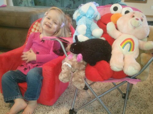 The caravan started while playing in Lauren’s room. We were having a “picnic” on the floor, and Lauren’s philosophy was the more the merrier. So, Elmo, Cheer Bear, Rapunzel, and giraffe, puppy and dinosaur friends joined us and the picnic became a party. When we moved the fun to the living room, Lauren decided to bring her friends, too. It took a few trips, but soon they were all settled in watching Super Why.
