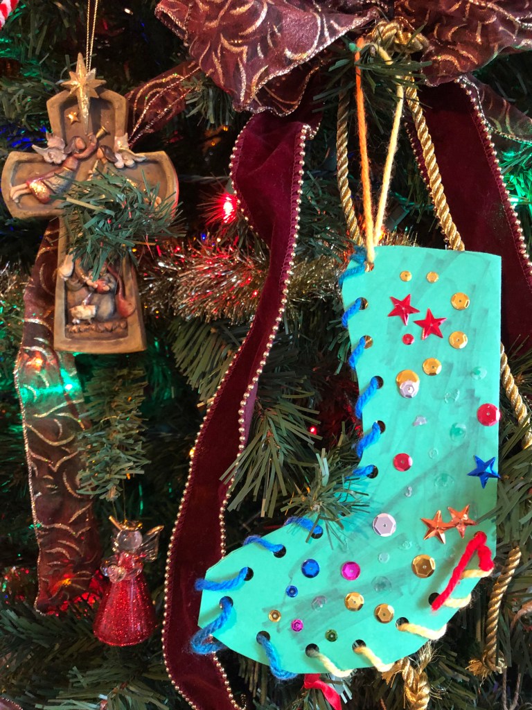 For instance, my favorite ornament on our tree is a construction paper stocking, stitched with yarn by small fingers, and half of the sequins are now missing. On the back is my son’s name, proudly written by a little boy after working on this special project together. It’s trash to most, but one I will always keep and prominently display.