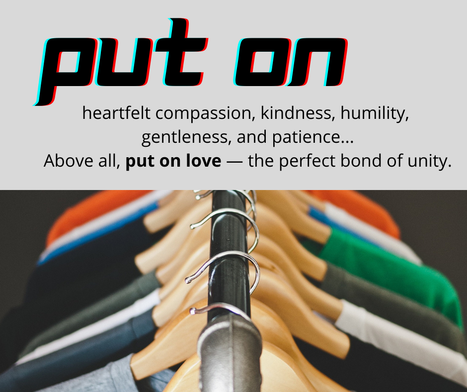 It’s the most important – what we cannot leave without. Scripture says, “above all.” The signature piece is love. Simple, pure, unblemished, the perfect piece that complements and sets apart. Love is the hallmark, the defining signature of a Christian. Above all, put on love. This love saturates, encompasses and is the lens through which we see everything else. We put on Christ when we put on love. Our Savior is love, His life is love, His eternal purpose is love. And when we wrap ourselves up in His love, our lives radiate the glory of His Gospel. His love is what pulls it all together. It is the perfect bond of unity. Love is the reason we are family, because God so loved each of us. Now that we believe, we are brothers and sisters – and can come together united in His love, as His church. Love now is our definition, and must be what we are known for, because of Whose we are.