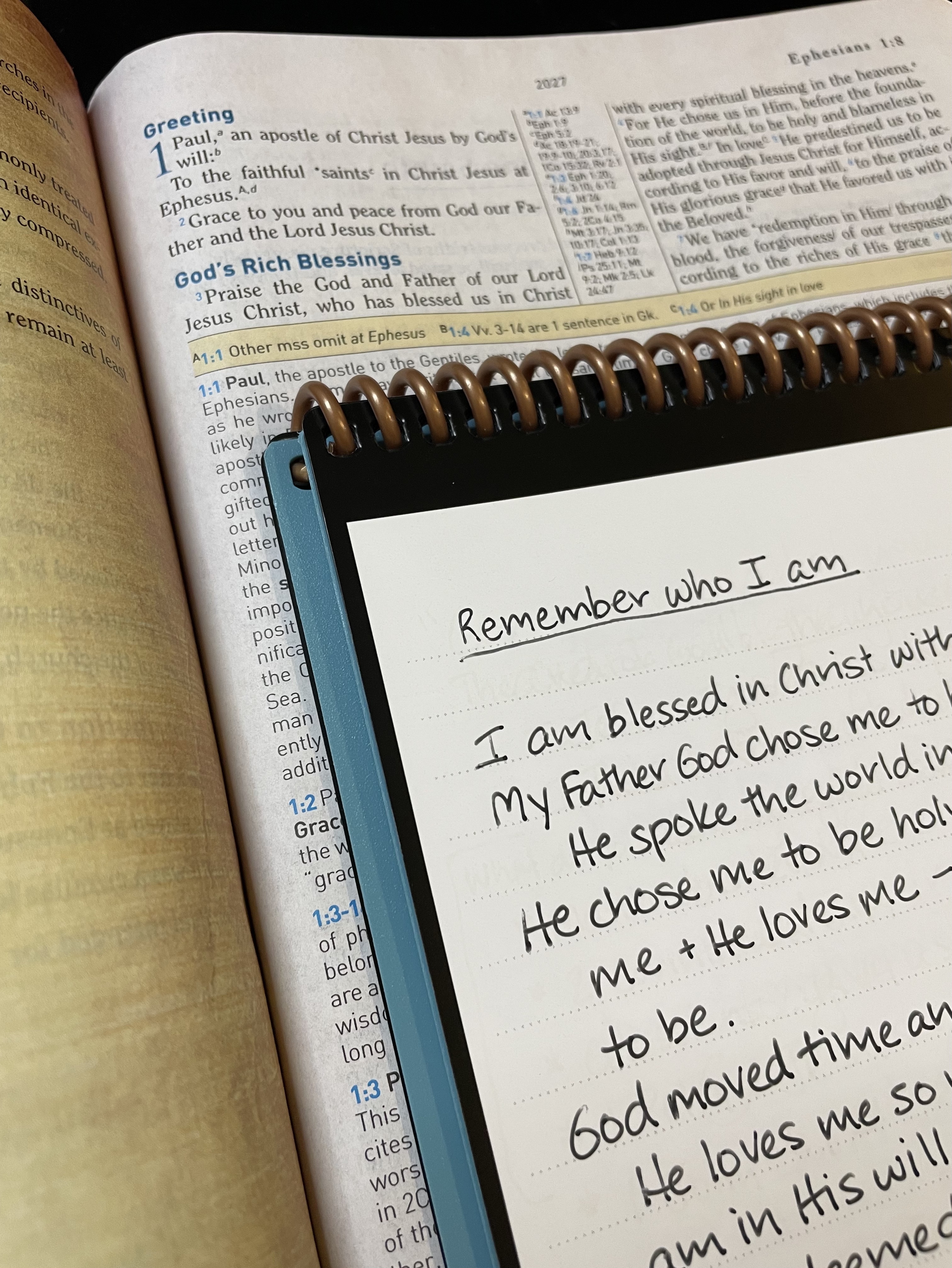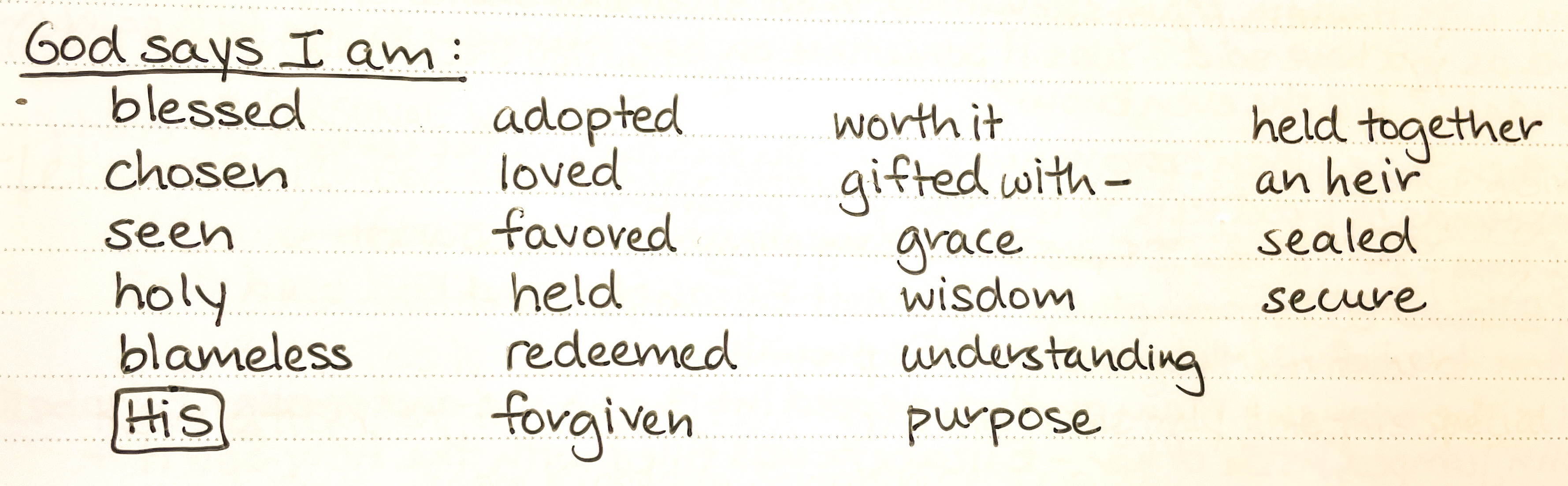 This past weekend I found myself needing reminded again of who I am, to hear the voice of my Savior speaking His love over me. So, I got out my Bible (my big leather-bound study Bible – a digital copy was not going to cut it), and opened it up to Ephesians Chapter 1. Focusing on vs. 3-14, which is actually one sentence in Greek, I wrote down every truth of what God says about me.
